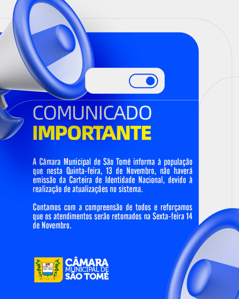 Informamos à população que nesta Quinta-Feira 13 de Novembro as emissões da Carteira de Identidade Nacional (CIN) retornaremos na Sexta-Feira, dia 14 de Novembro. Agradecemos a compreensão de todos! 💙 Câmara Municipal de São Tomé — Servindo com responsabilidade e compromisso com o cidadão.